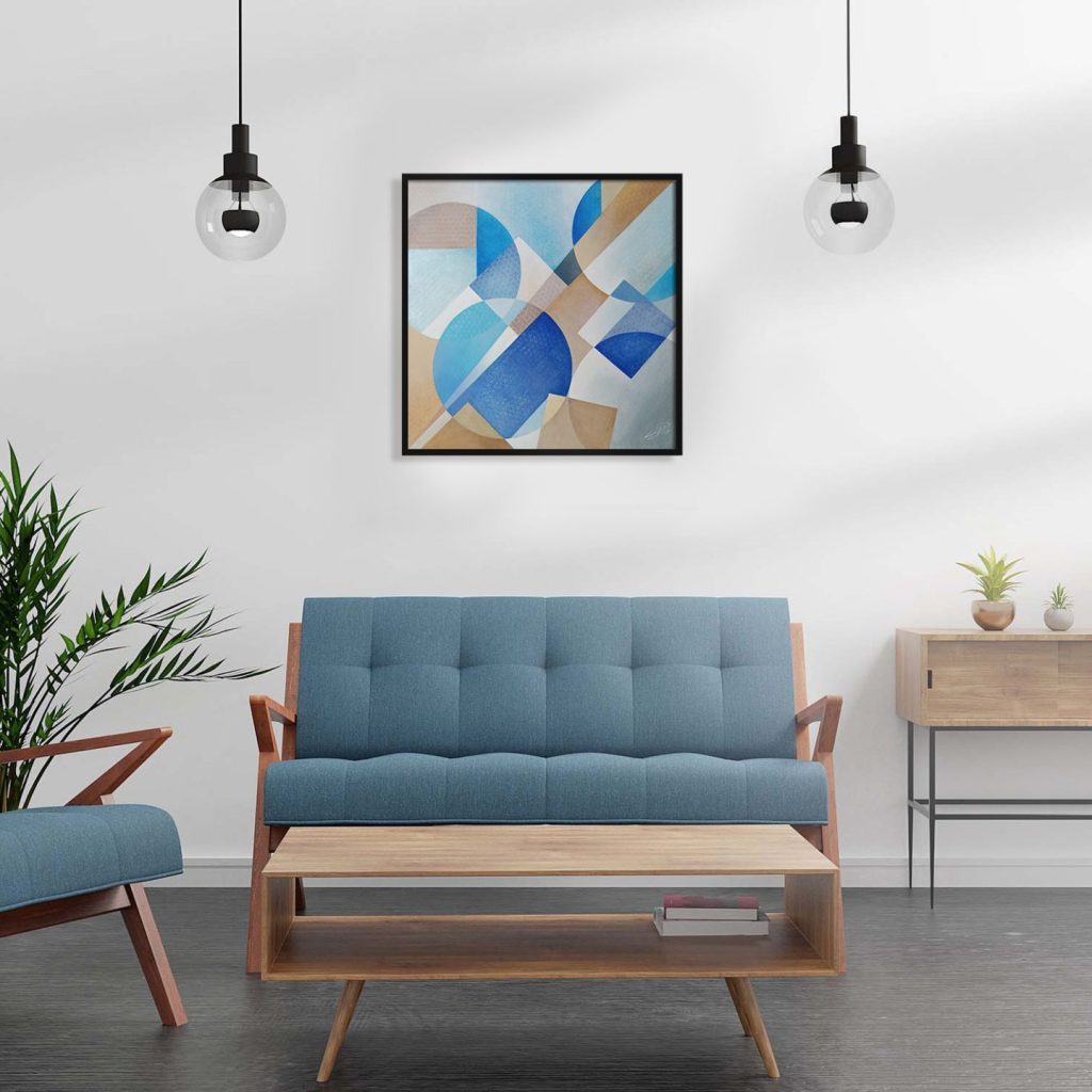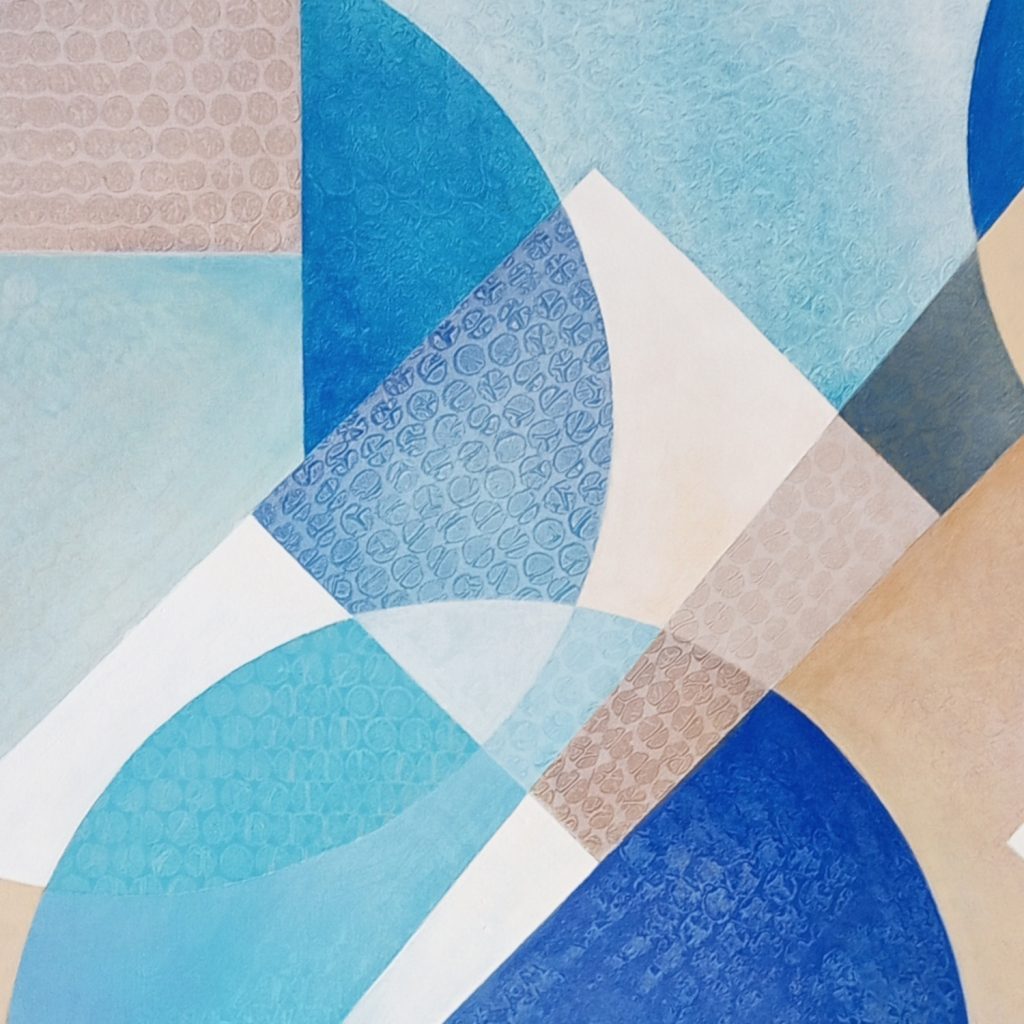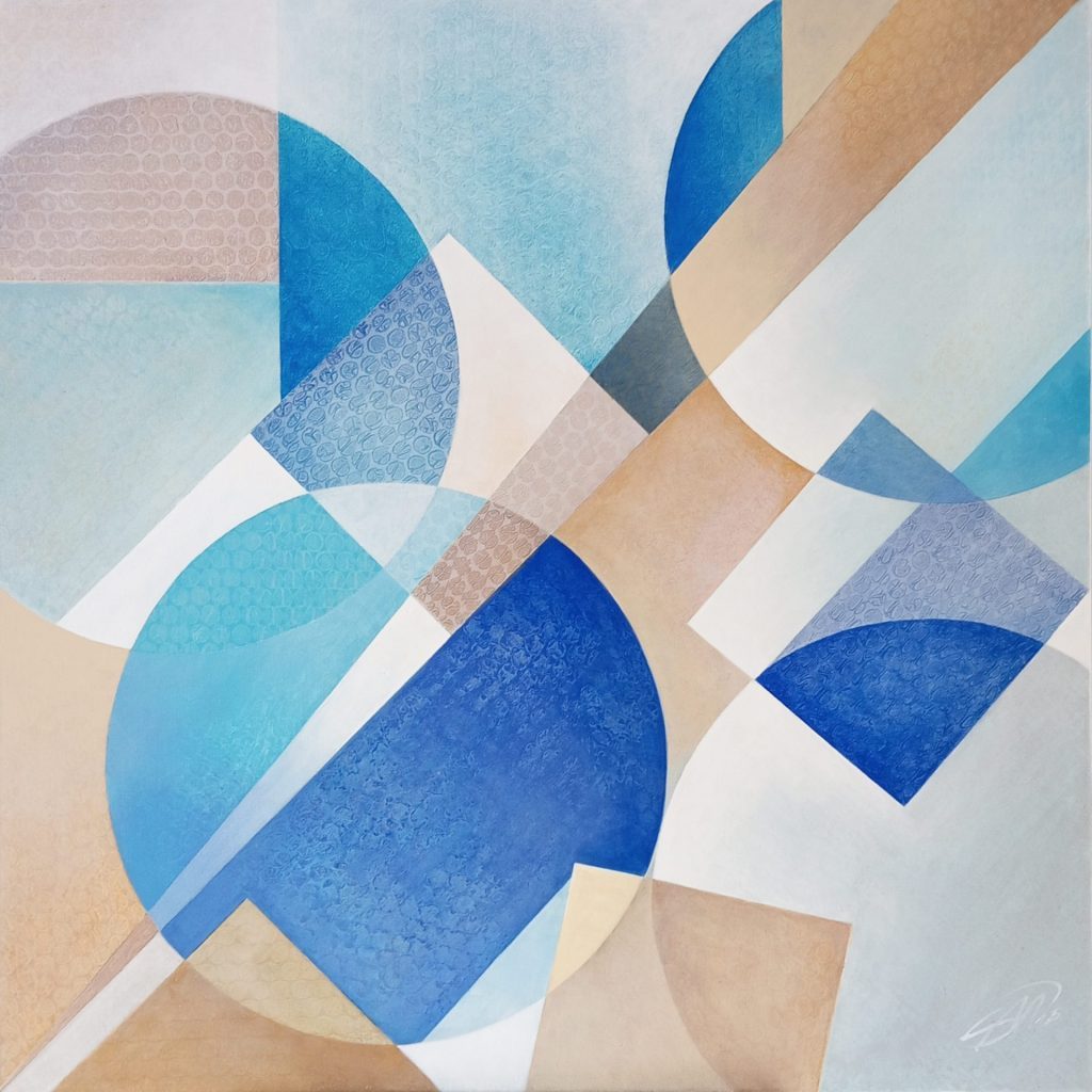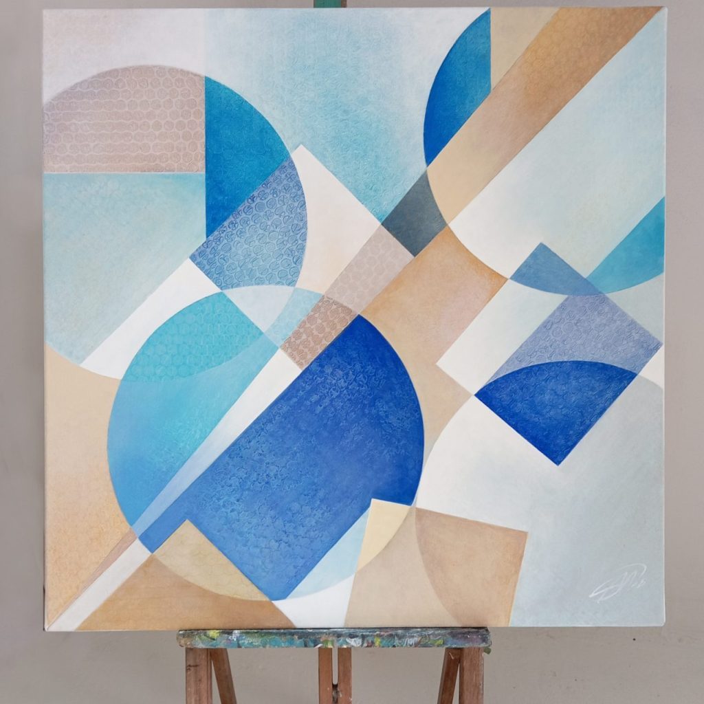 In questo studio geometrico astratto ho cercato di catturare le sensazioni, i ricordi e le visioni che il Mediterraneo ha suscitato in me. I colori acrilici metallici e iridescenti si trasformano con la luce e con il mio sguardo, rivelando continuamente nuovi riflessi e sfumature.