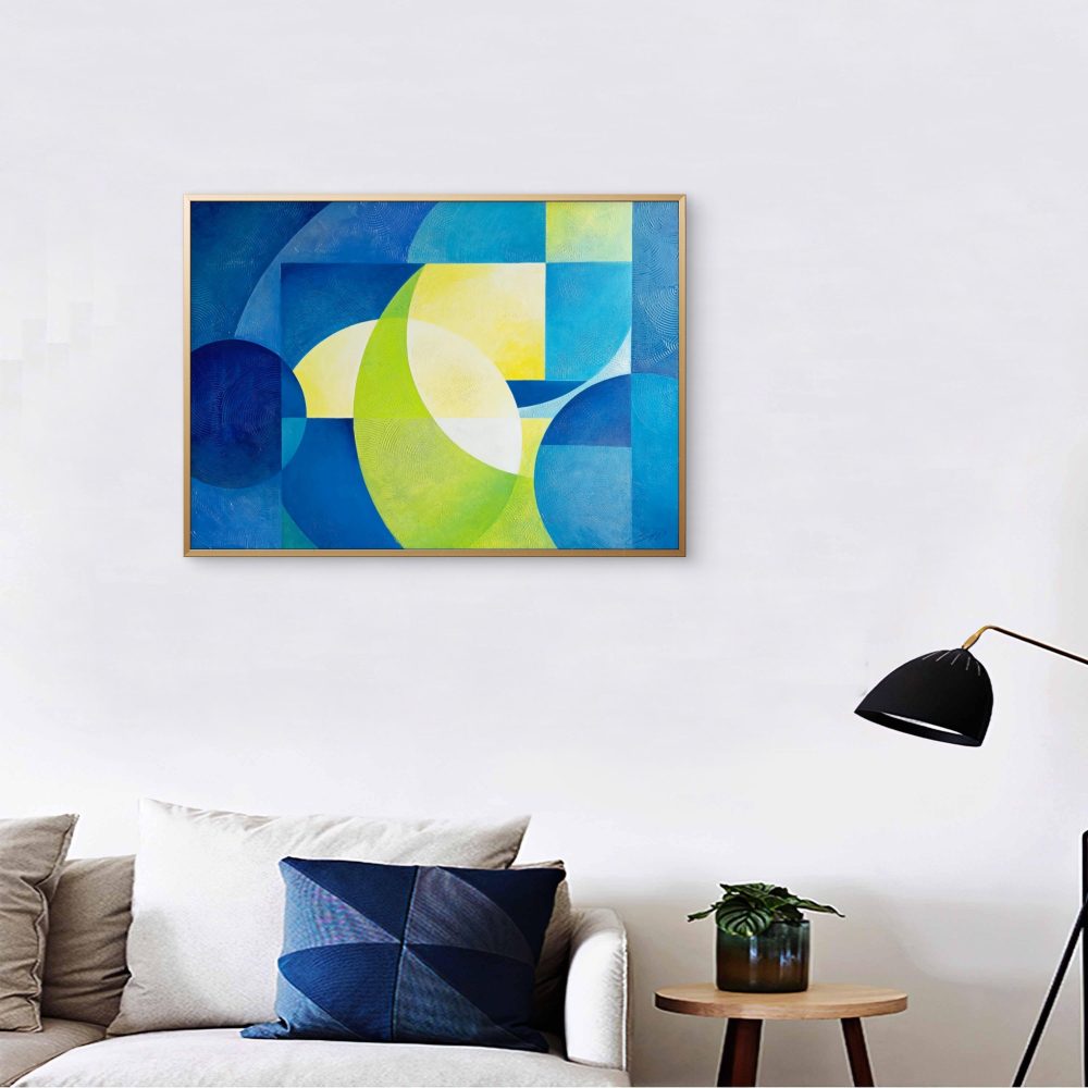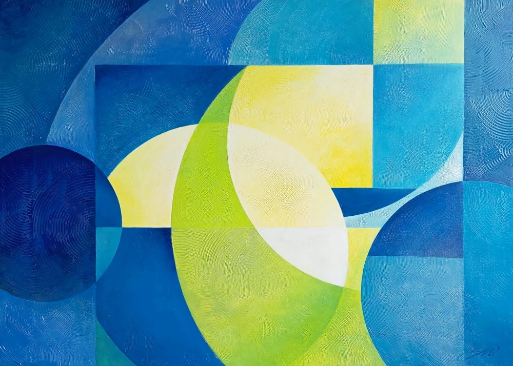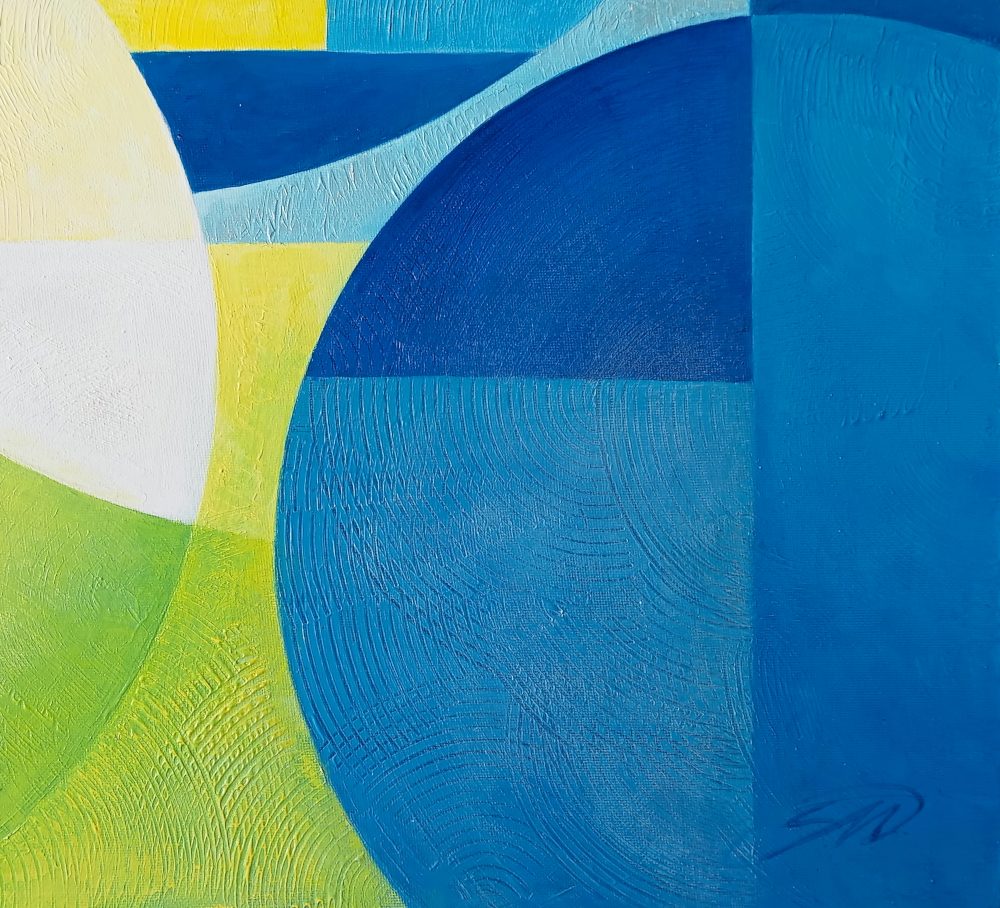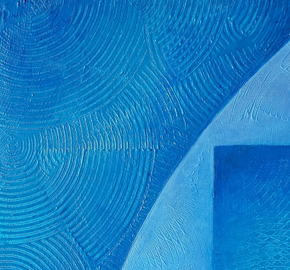 In questo studio geometrico astratto ho cercato di catturare le sensazioni, i ricordi e le visioni che il Mediterraneo ha suscitato in me. I colori acrilici metallici e iridescenti si trasformano con la luce e con il mio sguardo, rivelando continuamente nuovi riflessi e sfumature.